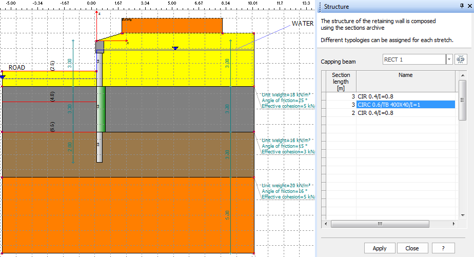 The structural composition is obtained by assembling elements that can have different sections. So, for instance, it is possible to use, for the same bulkhead, different resistant sections on the excavation depth. The following image provides an explanatory description of the previous concept: